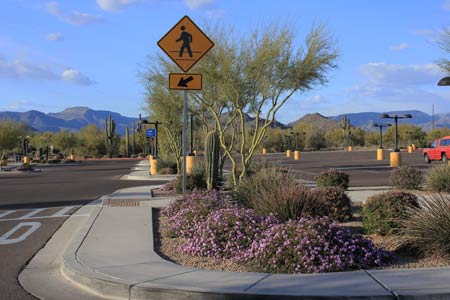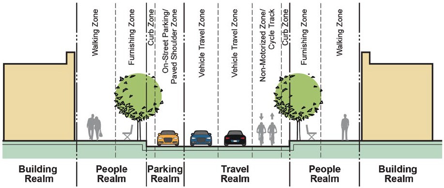 A street, alley or other thoroughfare or easement permanently established for the passage of persons or vehicles and under the legal authority of the municipality or agency having jurisdiction over said passage. The right-of-way includes all elements between the legally designated right-of-way lines, regardless of whether a portion of the right-of-way overlaps with private property. Within the right-of-way, the City (or other entity with jurisdiction over the right-of-way) may build or allow to be built, infrastructure and amenities to serve the public interest, including: streets, nonmotorized pathways, roadways, walkways, parking spaces, signage, traffic signals, landscaping, and amenities (i.e., benches, tables, garbage cans, etc.).